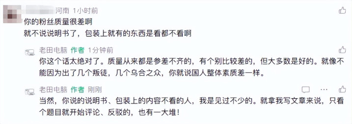 当然,对于你说的不看说明书,不看包装上信息的人,这老田是绝对相信的,并且还不少。老田文章的留言区,就见过很多这种只看个题目,就凭借自己的理解和想象开始评论、反驳的。